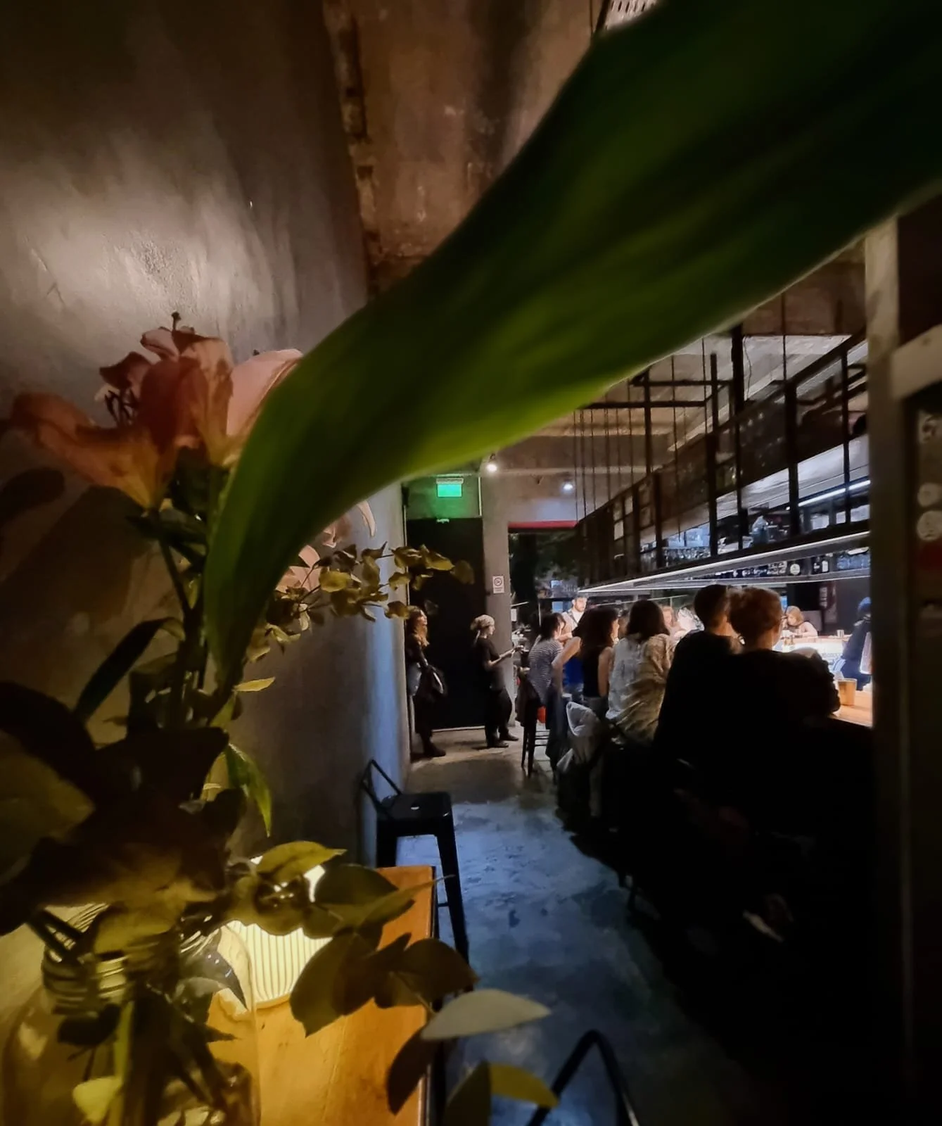 Vista de un restaurante o bar con personas sentadas en la barra, vista de interior con ambiente cálido y decoración moderna, flores en primer plano.